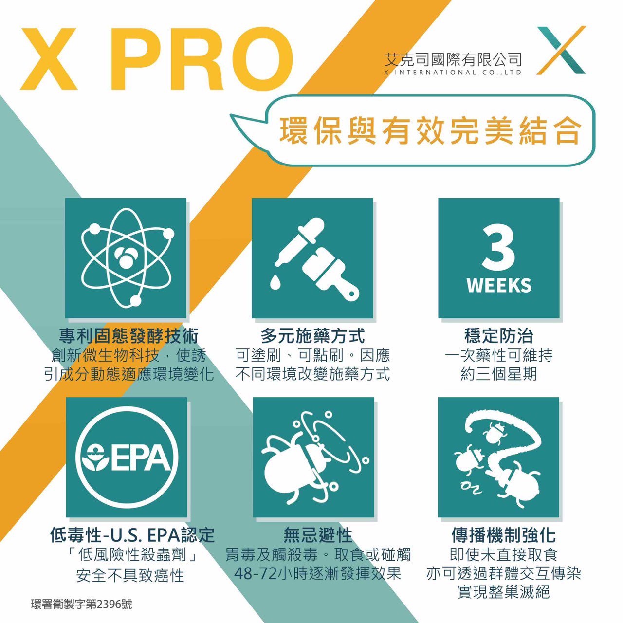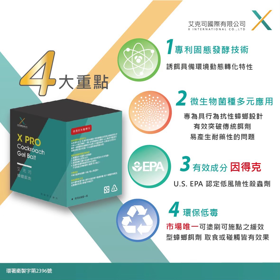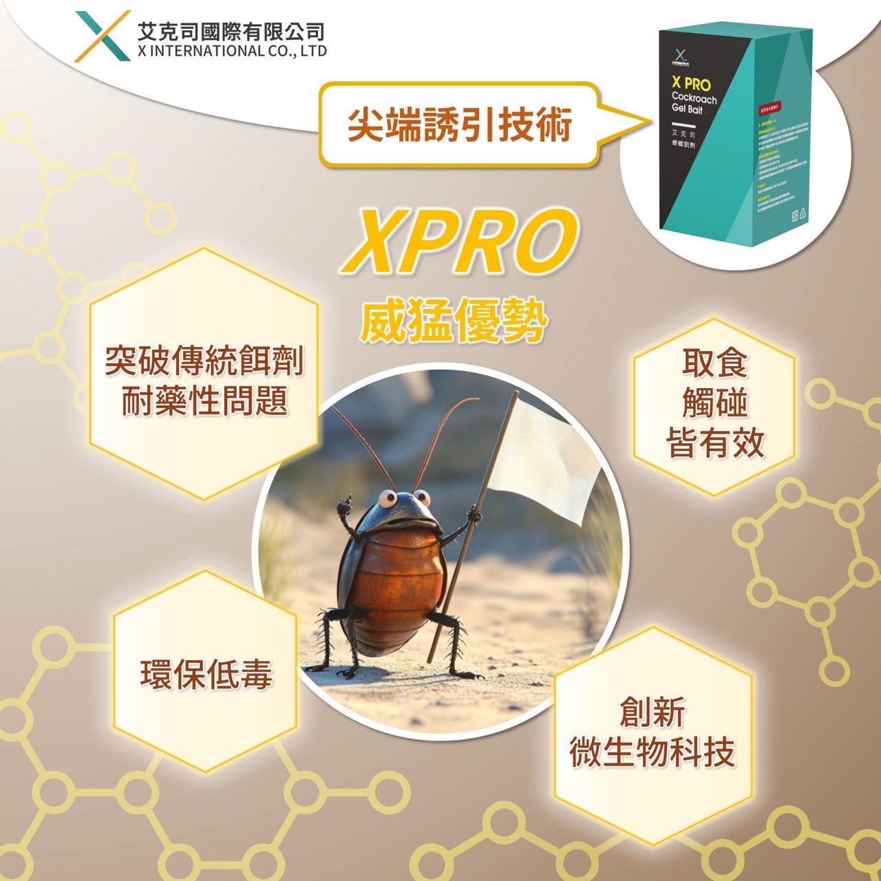 艾克司 XPRO蟑螂餌劑以因得克(Indoxacarb)為有效成分,由於其特有的緩效性質,因得克不會立即殺死蟑螂,而是讓它們有時間返回巢穴,通過與同伴的接觸和餵食產生連鎖效應,進一步擴大滅蟑的效果。